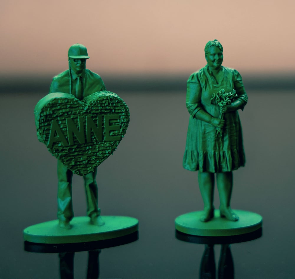 Rudy Flores and Teresa Estrella’s ongoing art project, Tiny Tributes, playfully integrates the role of miniatures in storytelling, memory-making, and childhood play. Tapping into the nostalgia of green Army Men figures, the artists cleverly repurpose the toy’s original mission: no longer faceless men serving in perpetual battle, these 3-D printed figures each have a unique story of their own, marching to their own beat. While the original toy may have glorified victory over a nameless foe, Tiny Tributes celebrates individual triumphs. Together, this motley crew unites to form a wonderous record of human stories, transforming into cherished mementos in an act of beautiful self-preservation, revealing who we are and what we love as a testament to our shared humanity.